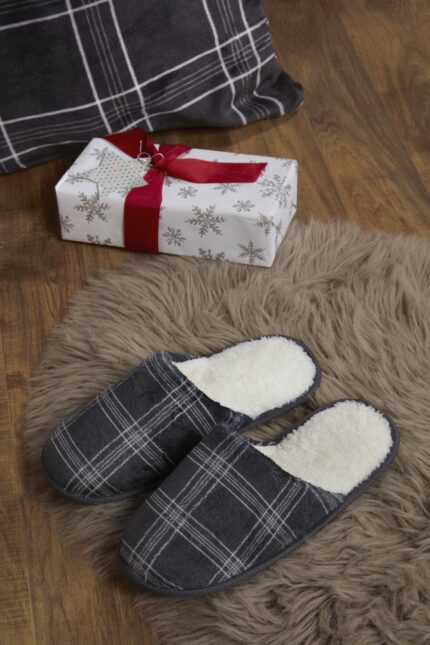 Mens Printed Check Fleece Slipper – Charcoal
