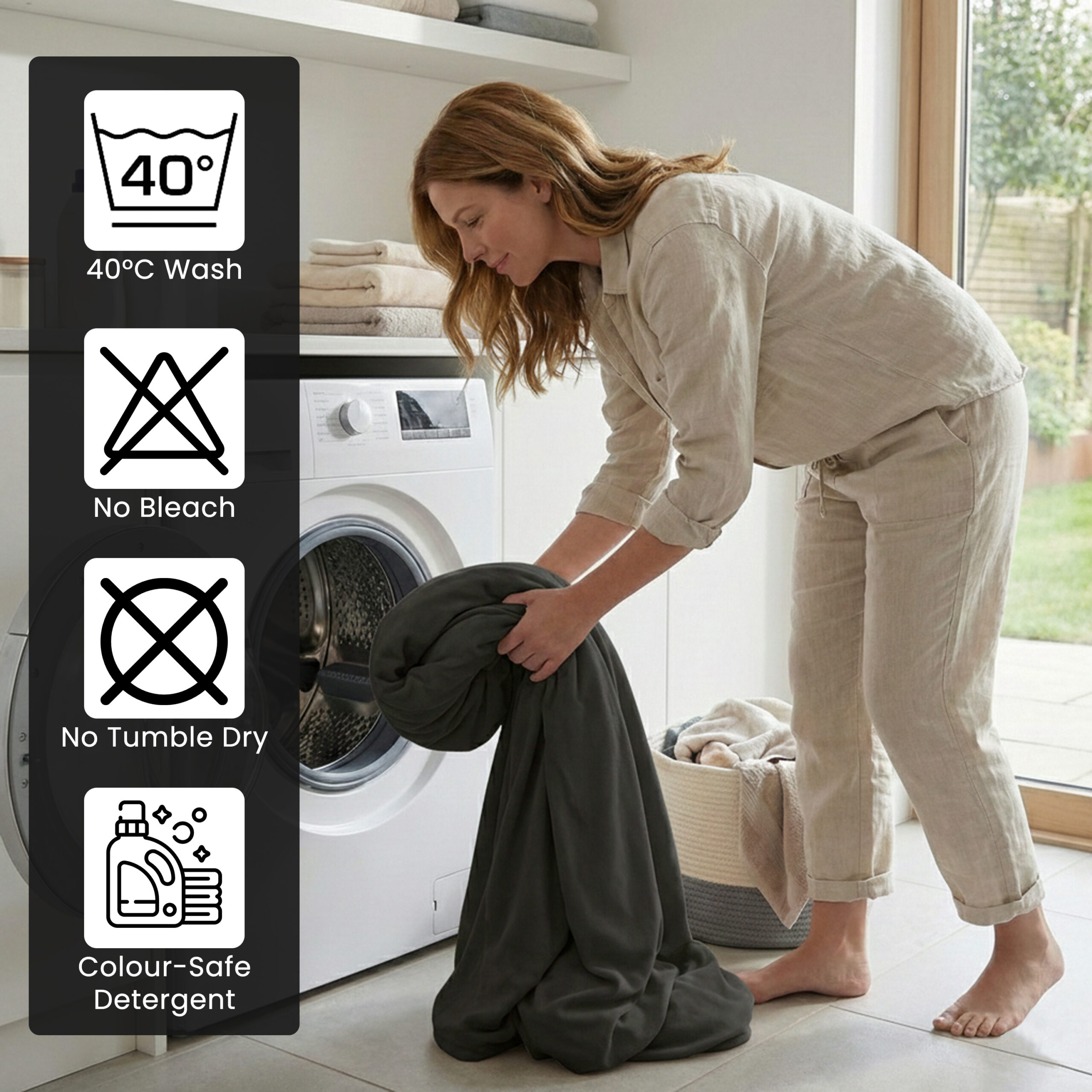 Machine washable at 40°C Iron and tumble dry at low heat
