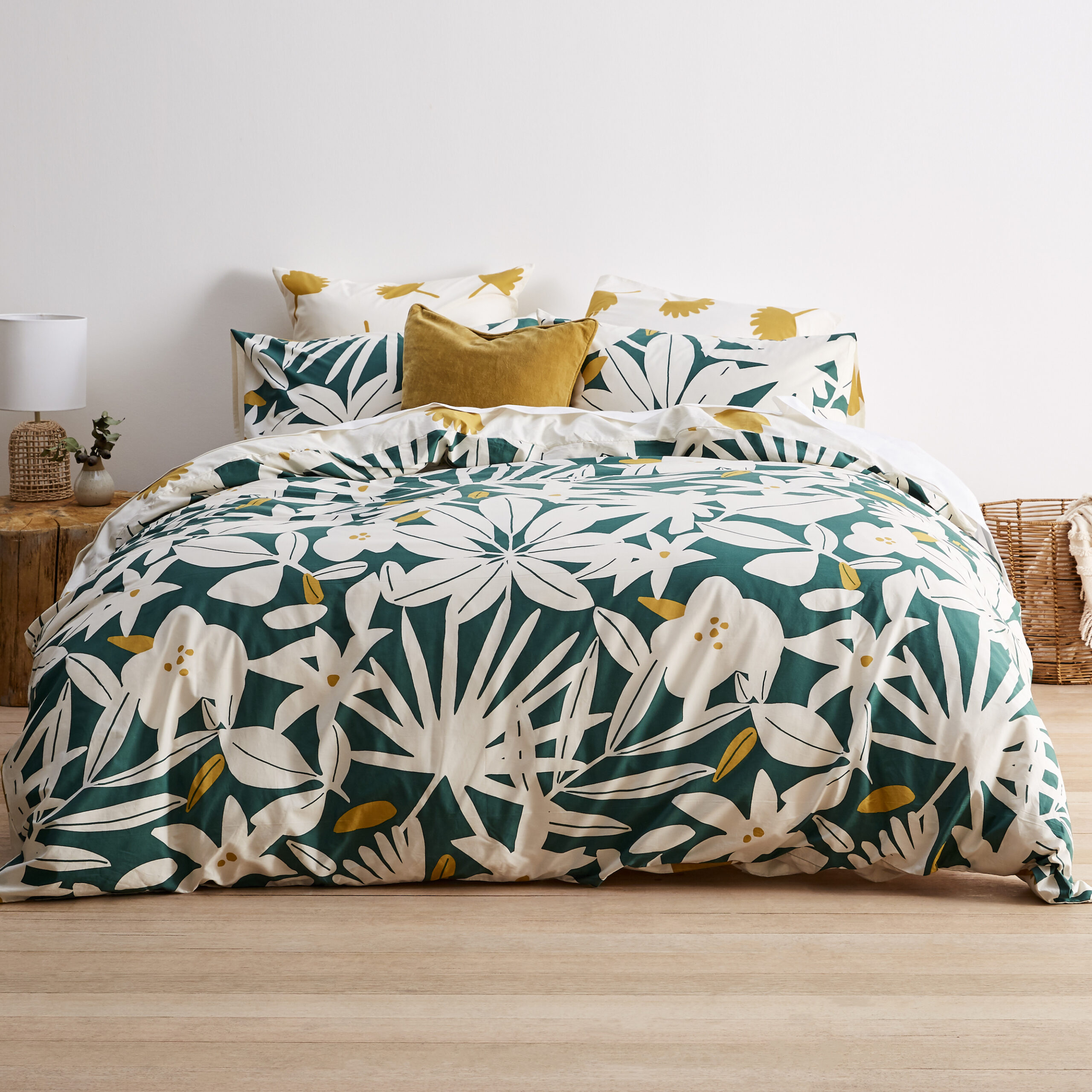 Arren Floral Teal White Ochre 100% Cotton 200 Thread Count Reversible Duvet Cover Quilt Bedding Set with Pillowcase.