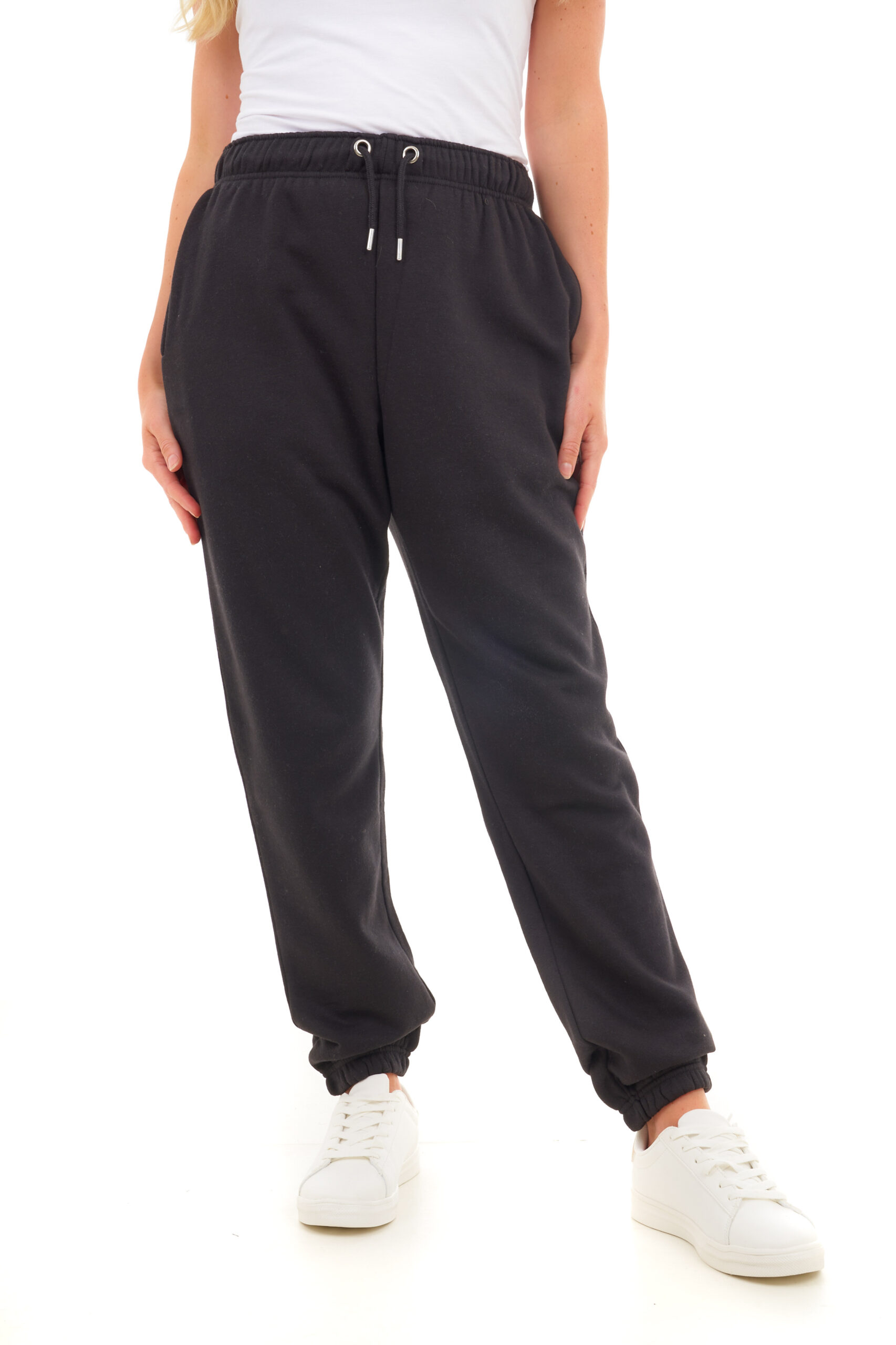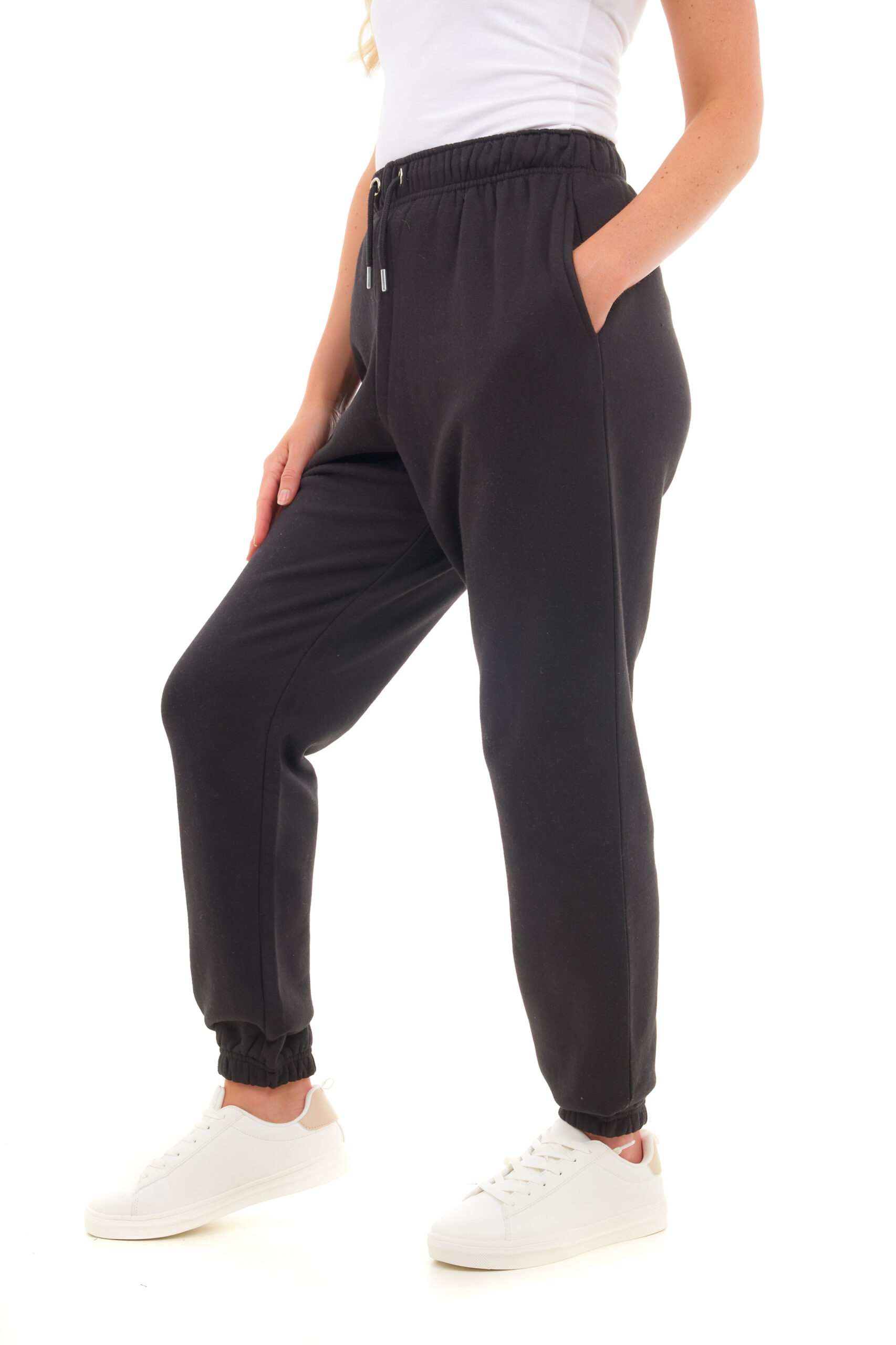 Design: Elastic waistband with drawstring, ribbed cuffs, oversized fit, and deep side pockets.