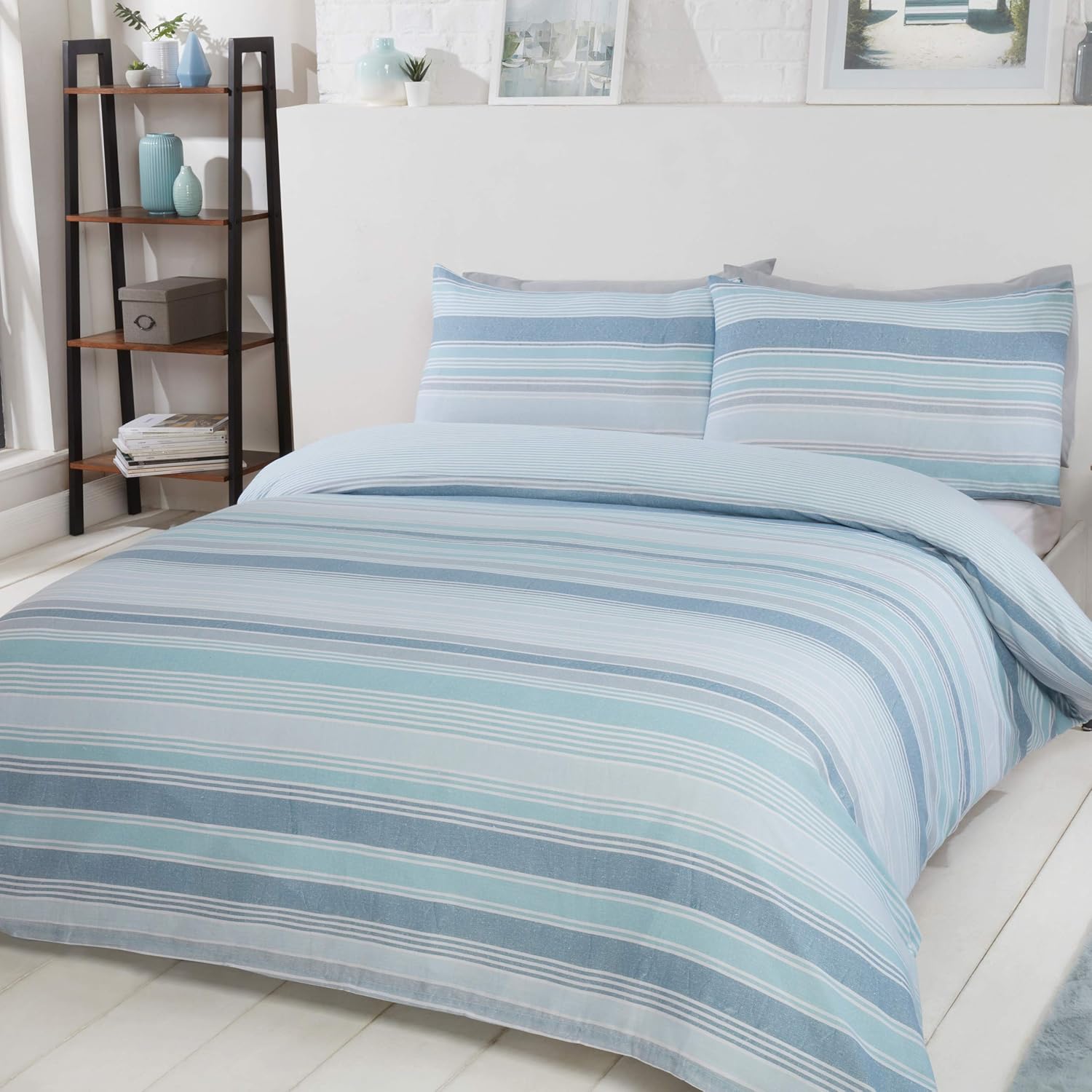 Infuse your bedroom with this cool crisp Chambray bedding set, with its calm stripe pattern In a choice of 4 colours. The horizontal stripes are soothing, and give the impression that your room is bigger than it really it, while the muted yet cheerful colours add a necessary pop to enliven the décor. This calm cotton mix duvet cover really is universal bedding. Duvet Cover Set Sizes (All sizes are approximate) Single: 1 x Duvet Cover (135cm x 200cm), 1 x Pillow Case (50cm x 75cm); Double: 1 x Duvet Cover (200cm x 200cm), 2 x Pillow Cases (50cm x 75cm); King: 1 x Duvet Cover (230cm x 220cm), 2 x Pillow Cases (50cm x 75cm); Super King: 1 x Duvet Cover (260cm x 220cm), 2 x Pillow Cases (50cm x 75cm) Machine washable at 40°CIron and tumble dry at low heat