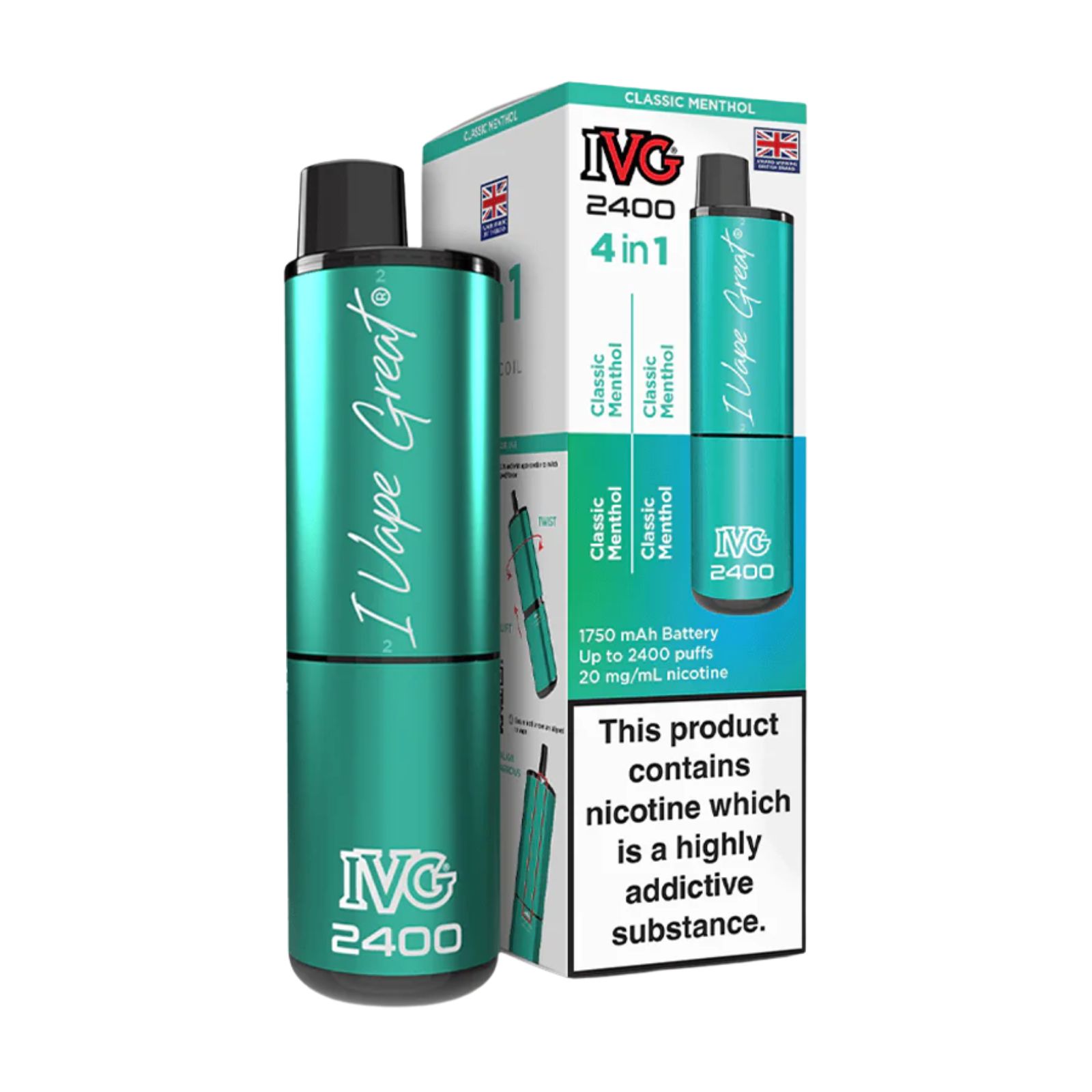 The IVG 2400 features four 2.0ml pre-filled pods, each delivering consistent flavour and nicotine performance. The built-in 1750 mAh battery powers the device to provide up to 2400 puffs in total. Each pod contains 20 mg/mL nicotine strength, carefully formulated for a balanced and satisfying draw.