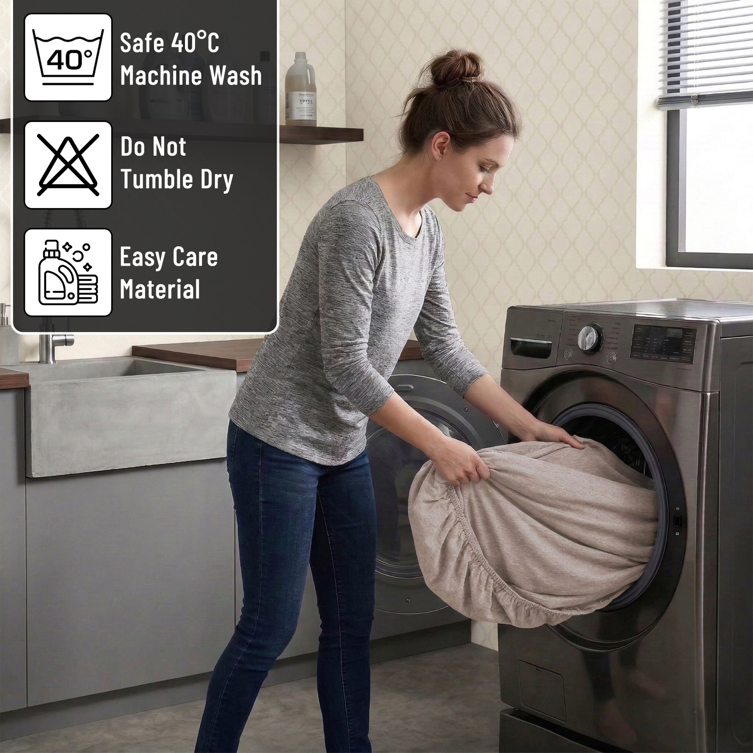 Machine washable at 40°C, Iron and tumble dry at low heat.