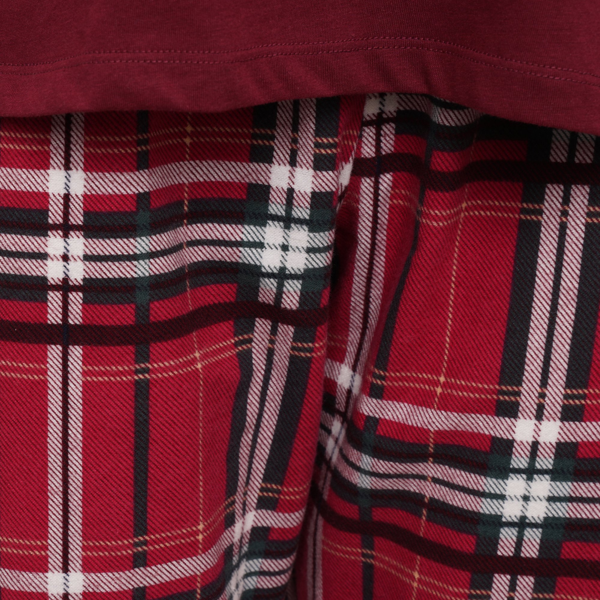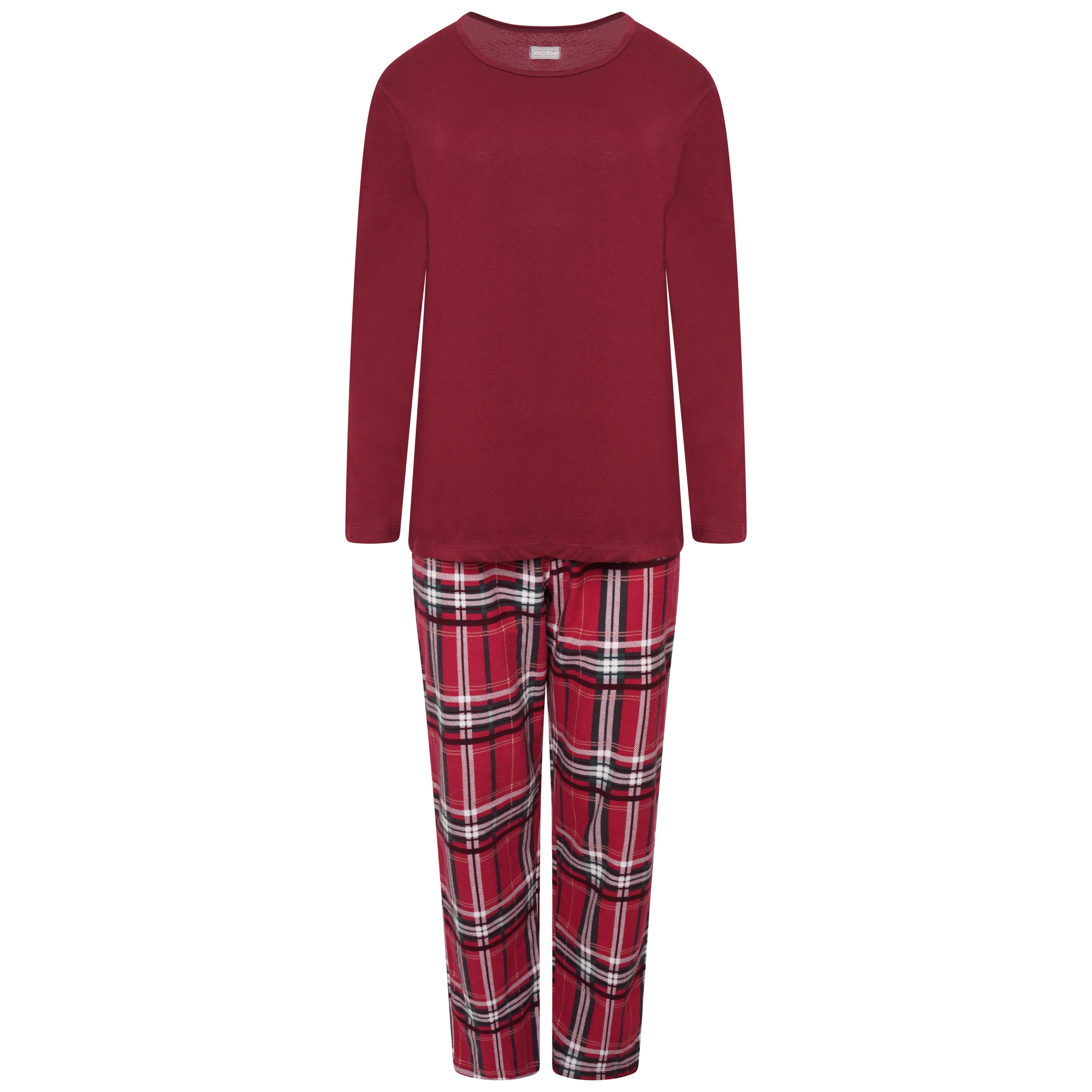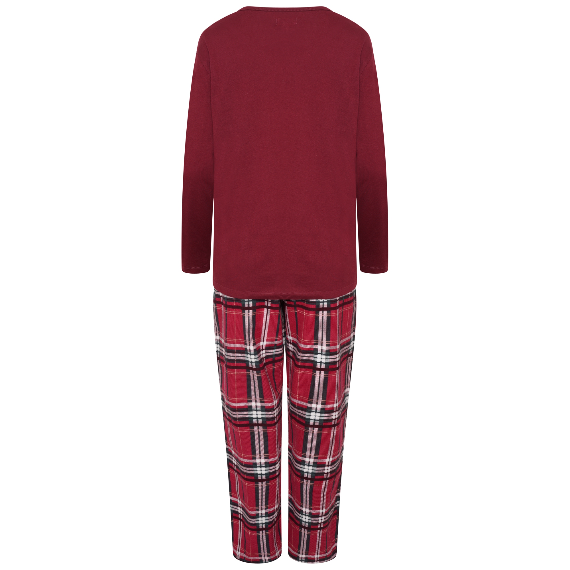 The two-piece set includes a plain red long-sleeve top paired with full-length red check print bottoms, creating a classic and comfortable look.