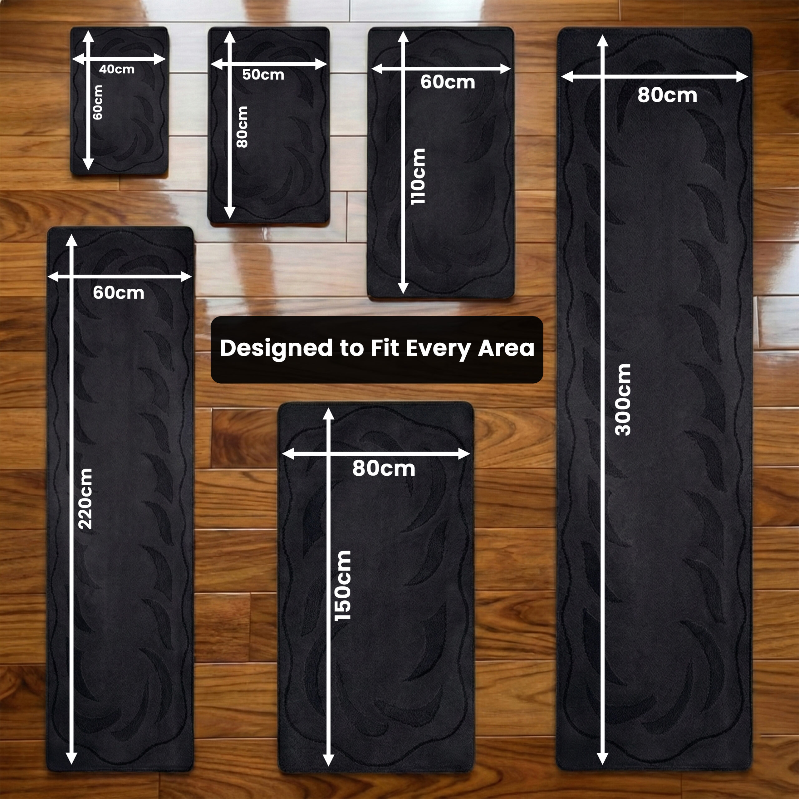 40cm x 60cm (1.3ft x 1.95ft), 50cm x 80cm (1.6ft x 2.6ft), 60cm x 110cm (2ft x 3.5ft), 60cm x 220cm (2ft x 7.2ft), 80cm x 150cm (2.6ft x 5ft), 80cm x 300cm (2.6ft x 9.8ft)