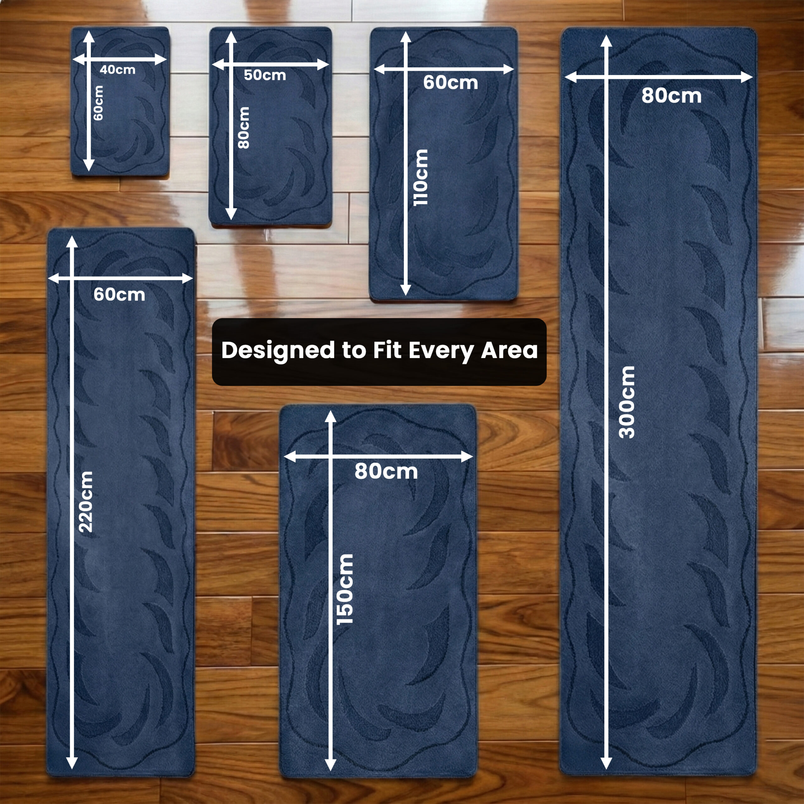 40cm x 60cm (1.3ft x 1.95ft), 50cm x 80cm (1.6ft x 2.6ft), 60cm x 110cm (2ft x 3.5ft), 60cm x 220cm (2ft x 7.2ft), 80cm x 150cm (2.6ft x 5ft), 80cm x 300cm (2.6ft x 9.8ft)