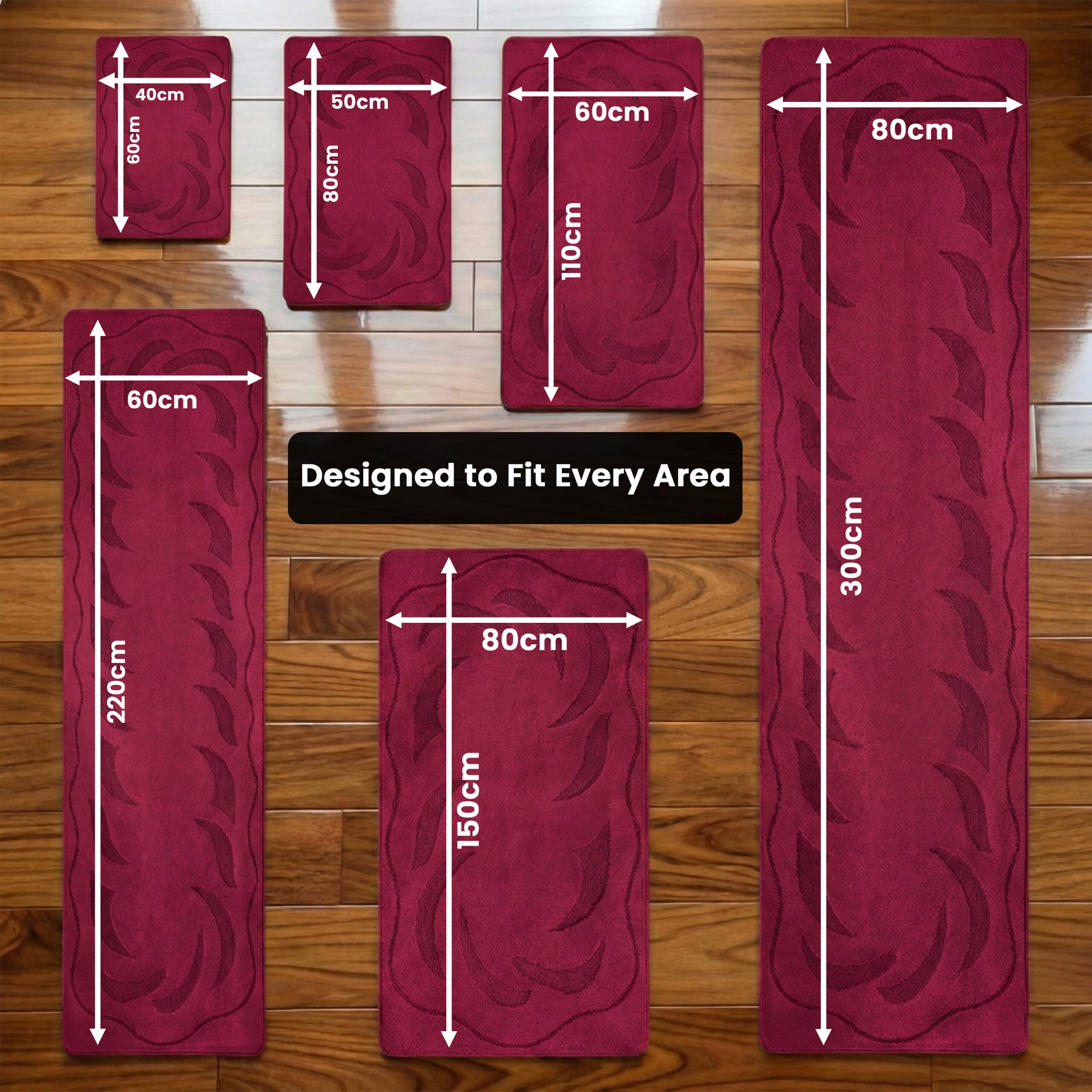 40cm x 60cm (1.3ft x 1.95ft), 50cm x 80cm (1.6ft x 2.6ft), 60cm x 110cm (2ft x 3.5ft), 60cm x 220cm (2ft x 7.2ft), 80cm x 150cm (2.6ft x 5ft), 80cm x 300cm (2.6ft x 9.8ft)