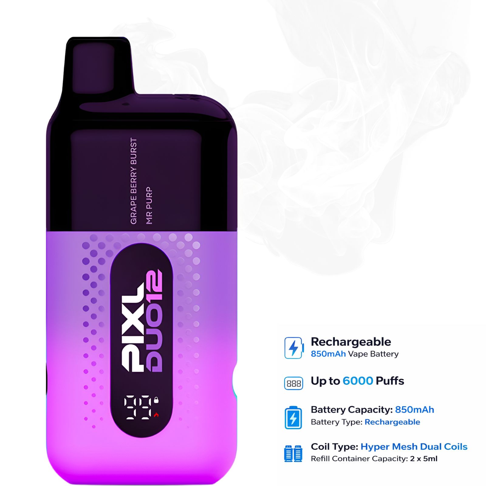 The PIXL DUO12 Rechargeable Vape Device is designed for long-lasting performance and smooth vapor delivery. Featuring a powerful 850mAh rechargeable battery and advanced Hyper Mesh Dual Coil technology