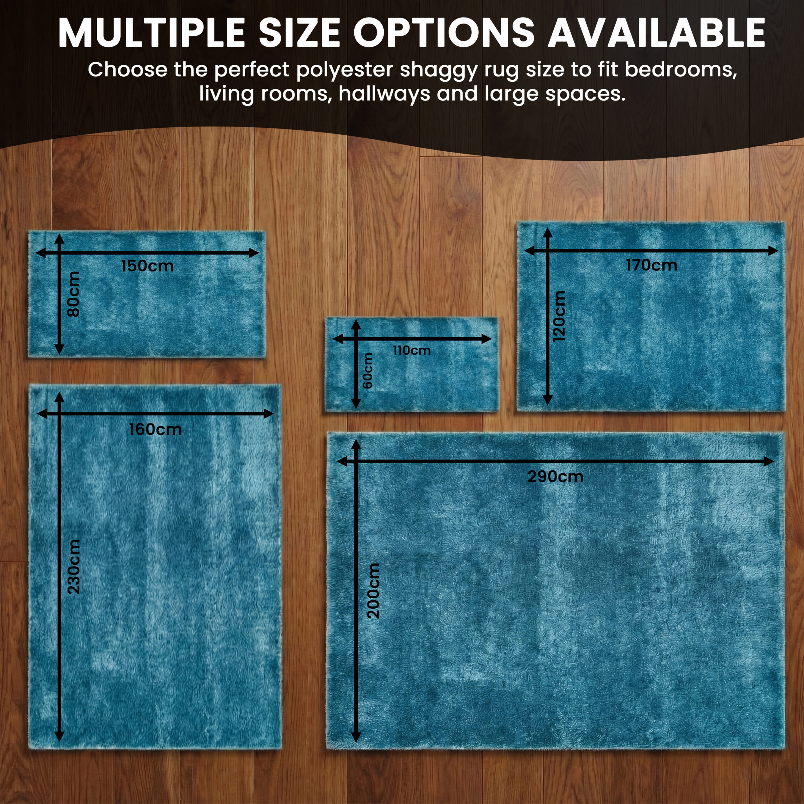 60cm x 110cm (2ft x 3.5ft), 80cm x 150cm (2.6ft x 5ft), 120cm x 170cm (4ft x 5.5ft), 160cm x 230cm (5.2ft x 7.5ft), 200cm x 290cm (6.5ft x 9.5ft)