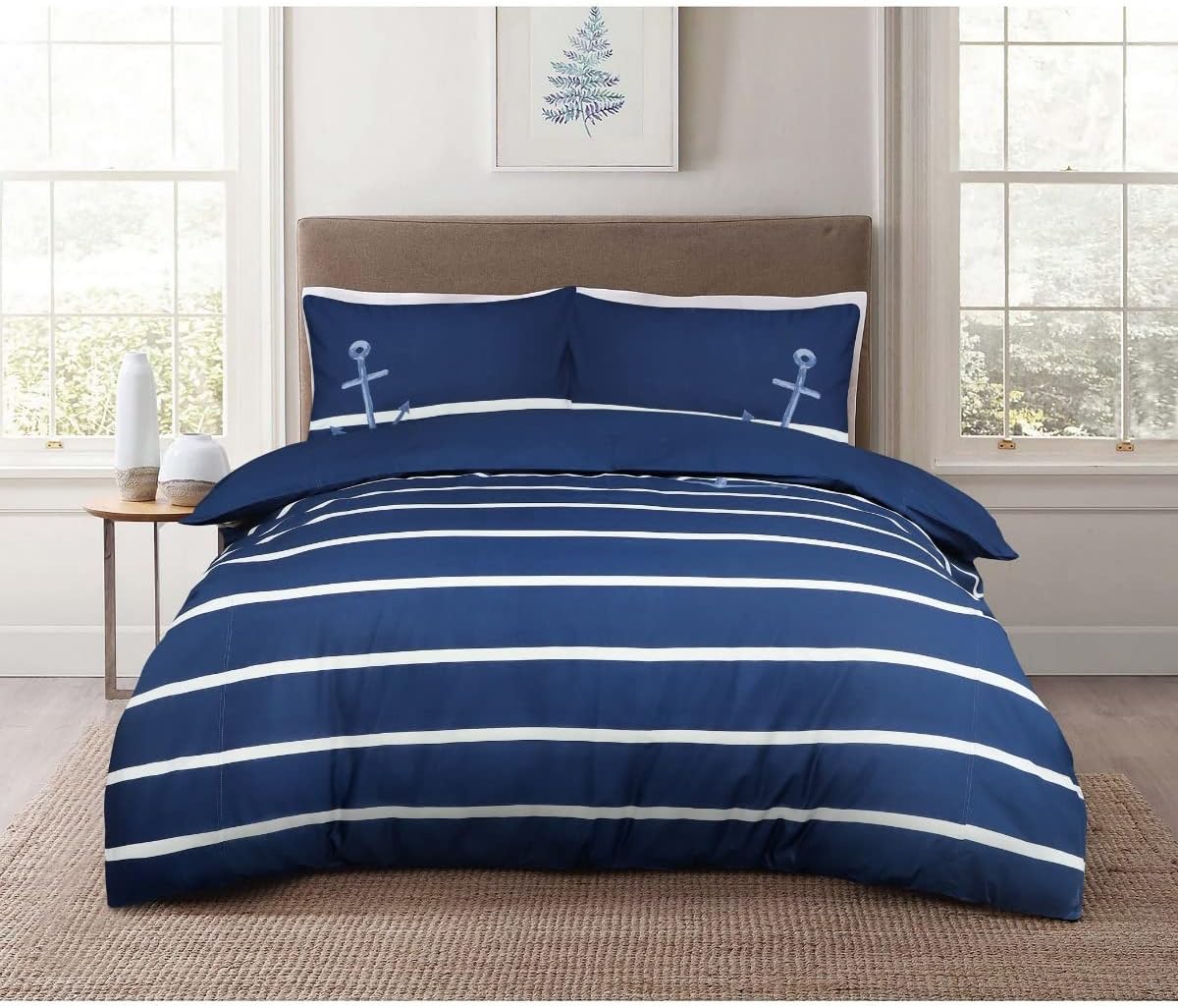 Sailor Striped Blue 100% Cotton Plain Reverse Duvet Cover Quilt Pillow Case Bedding Set Soft Easy Care.