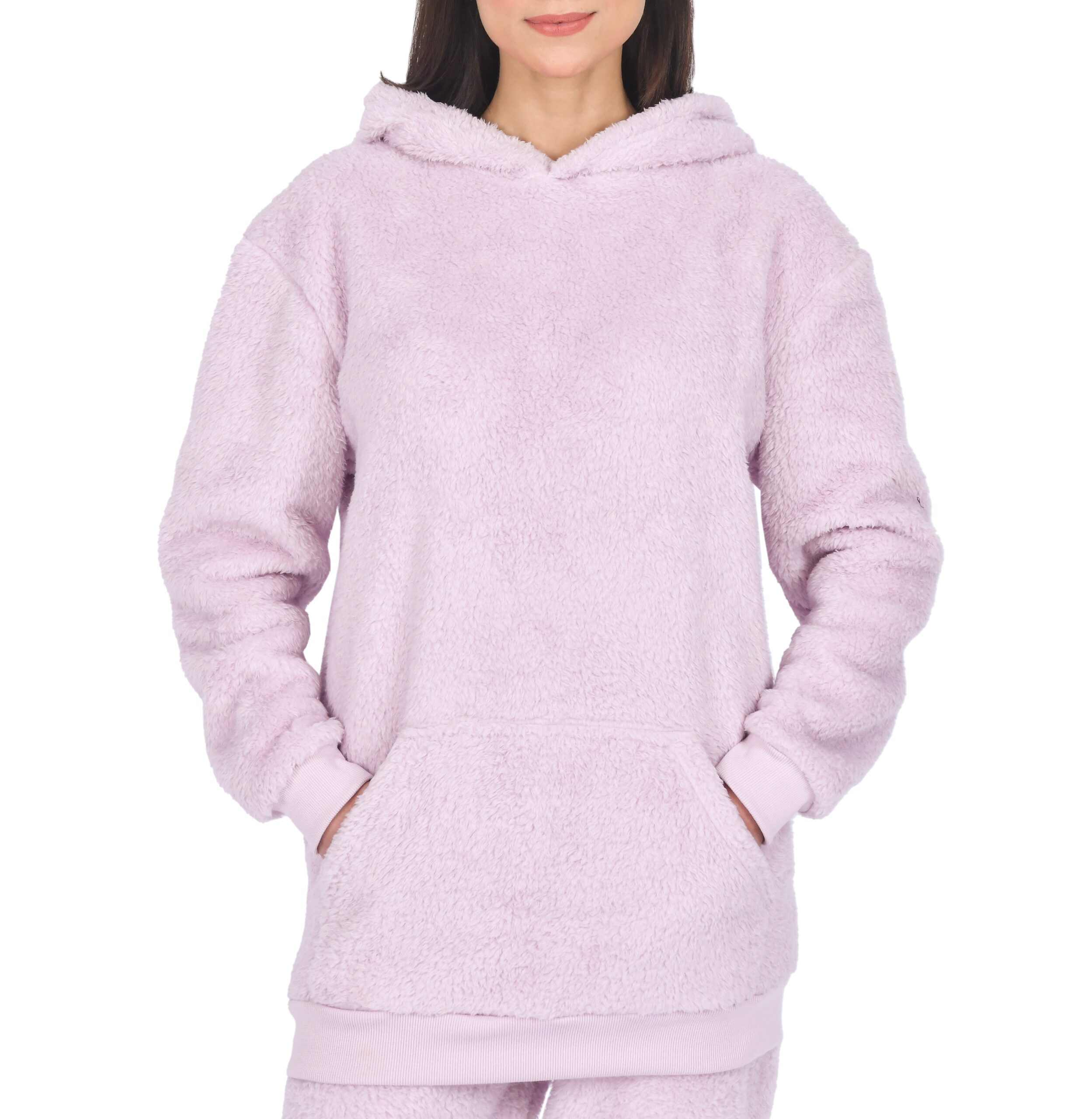 Wrap yourself in ultimate comfort and style with our Women’s Teddy Fleece Hoodie, the perfect blend of coziness and fashion. Crafted from 100% polyester, this hoodie offers a plush, ultra-soft feel that’s ideal for lounging at home or stepping out on casual errands. Its extra-length fit ensures full coverage and warmth, while the kangaroo pocket provides both functionality and a touch of laid-back style. Cuffed sleeves and a ribbed hem enhance its snug fit and chic appeal.